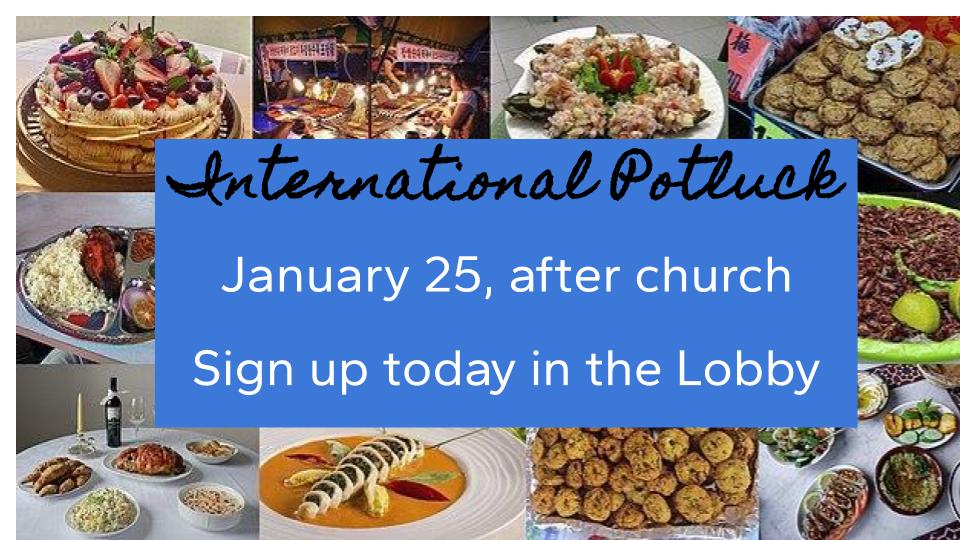 It’s an annual tradition! Every year at the end of January’s focus on Global Missions, we have an international Potluck. This is your opportunity to pull out that favorite recipe that features a dish from another part of the world. Please sign up to bring food and help with preparations for this event. See Sharon E. for more information.