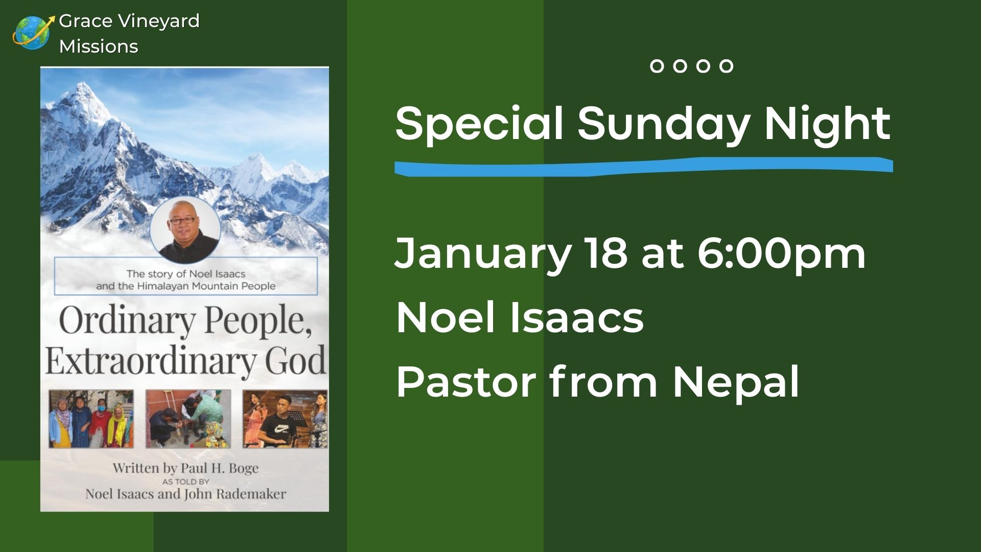 Several months ago I was at a Vineyard Pastors meeting where we had a special guest from Nepal sharing with us. He was fascinating. I learned that there is a region in the Himalayas that is for the first time in history right now the center of a church planting movement, and can you believe it — it’s primarily a movement of Vineyard church plants. The guy speaking was from Nepal and his name is Noel Isaacs. I asked the leader of the meeting if Noel would be back in the U.S. in January cuz we’d love to have him speak at Grace Vineyard, and a few weeks ago I found out he is going to be here, and we do get to host him on January 18th for an evening meeting. I would recommend you purchase his book Ordinary People, Exraordinary God, to hear about his amazing story. Even more, please make plans to join us on Sunday Night, January 18th, at 6pm!