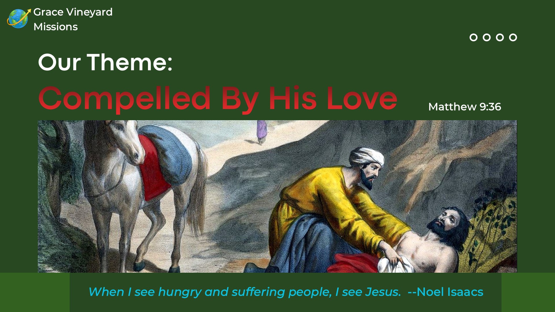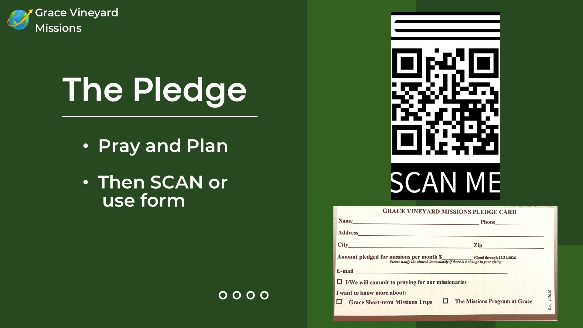 Every year we refresh our commitment to Global Missions both as a corporate congregation and individually. A number of you committed last year to pray for our missionaries and a number of you commited to participate financially in supporting our missionaries around the globe. That commitment is now complete, so we are asking everybody to pray about committing to missions for 2026. That means that we hope, but do NOT assume, that you will be continuing your commitment from last year. We are collecting new commitments for financial support this month. At the end of the month we will see what the individual commitments are and then we will inform the missionaries we support what we plan on sending every month to support their work. Now, as a pastor of a missions focused church, I want you to know that it is my hope and vision for every person who calls Grace Vineyard their home to join the team, no matter how small or large your commitment. I know from experience that if you commit to only, say, $10 per month, your heart will follow your money (as Jesus said it would), and you will be thinking about and praying for our missionaries.