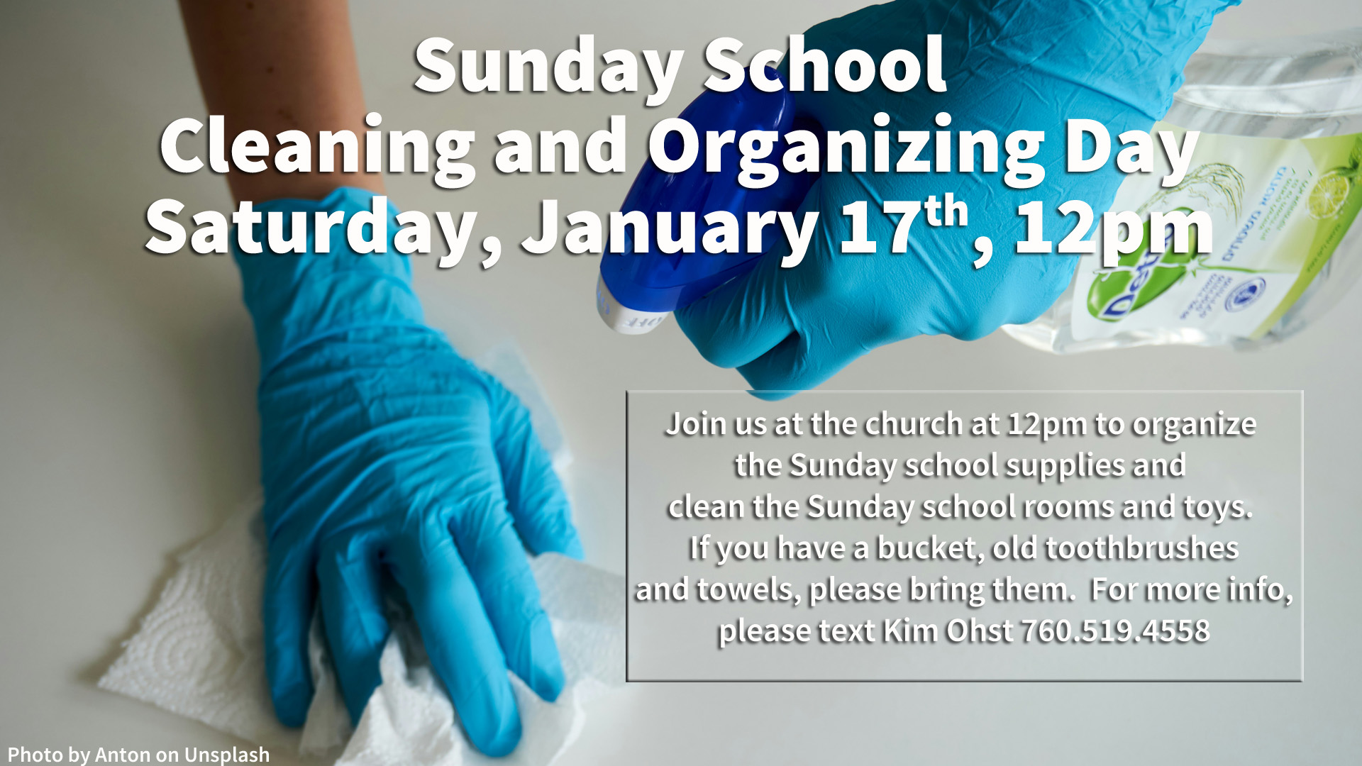 Join us at the church on Saturday, January 17th at 12pm to organize the Sunday school supplies and clean the Sunday school rooms and toys. If you have a bucket, old toothbrushes and towels, please bring them. For more information, please text Kim Ohst 760-519-4558