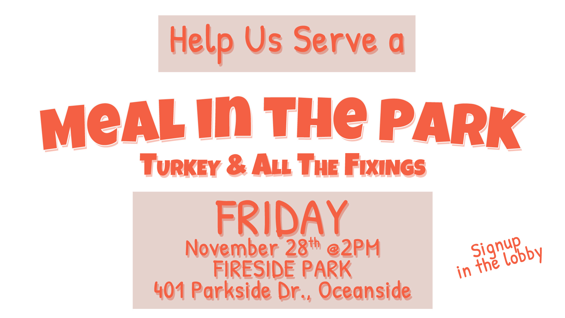 Thanksgiving is about 3 weeks from now. We’re going to be joining Convicted For Christ ministries to put on a Thanksgiving Dinner with all the fixings in Fireside Park on Friday of Thanksgiving week for our unsheltered neighbors. That means we’ll need Turkeys, mashed potatoes and gravy, vegetables, rolls, pies, etc, and especially we’ll need people who can help serve the meal. It will be at 2PM on Friday, November 28th, at Fireside Park in Oceanside. Michael and Brandi will be in the lobby on Sunday to help you get all signed up for what you’ll be bringing.