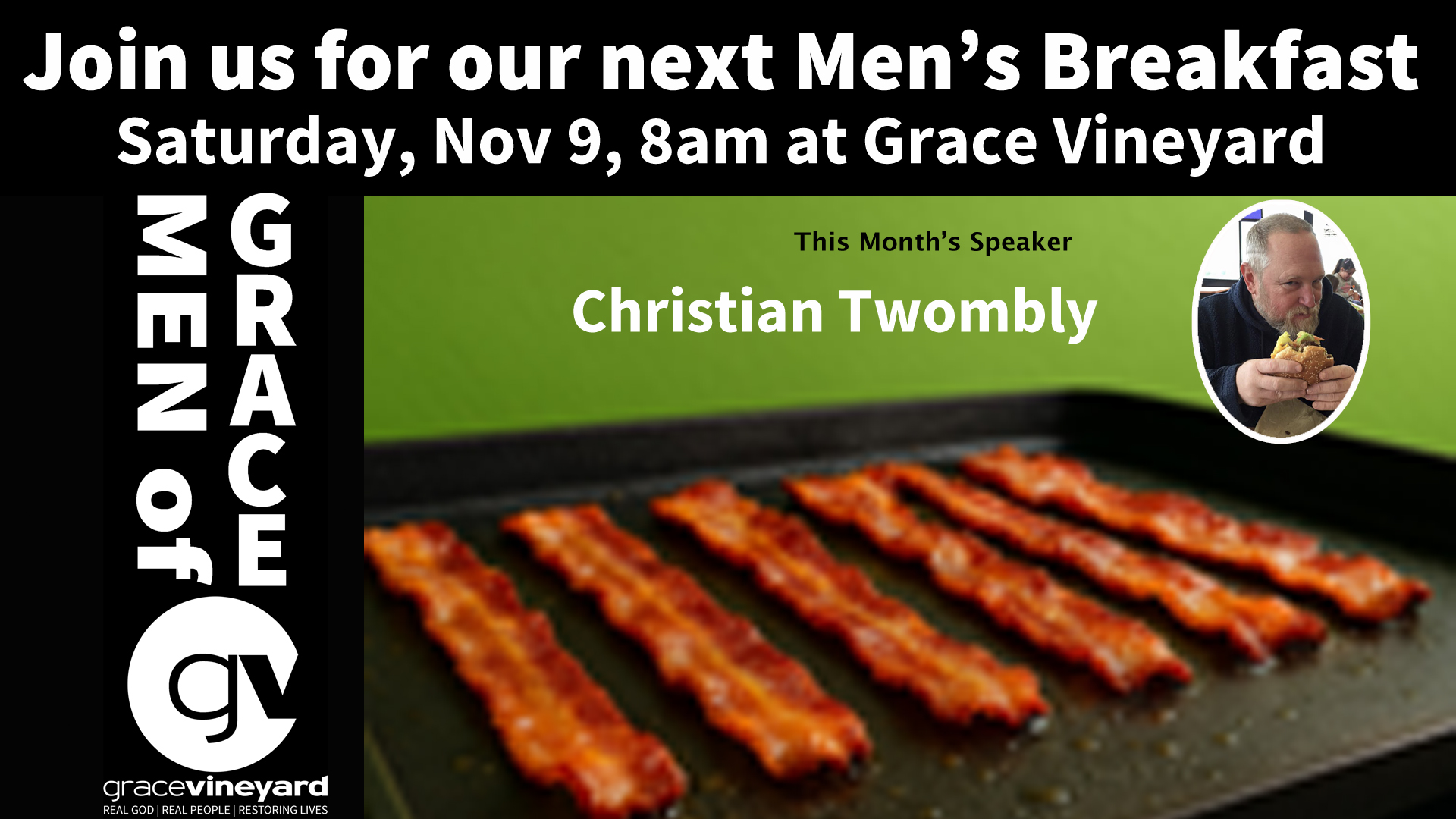 Our monthly Men’s Breakfast is also next Saturday. We meet at the church for a delicious breakfast, fellowship, worship, an inspiring word from one of the guys, and time to pray for each other. All Men are invited! It starts at 8am, and our speaker this month is Christian Twombly. Bacon anyone?!