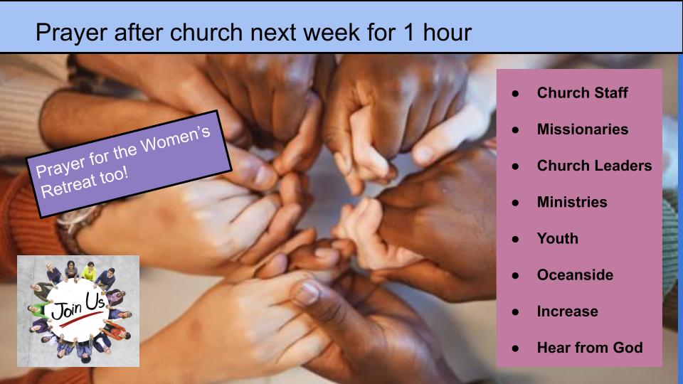 We will be praying for the Ladies Retreat after church on the terrace right after the morning service at church. Please join us as we build a foundation of prayer for our time together!