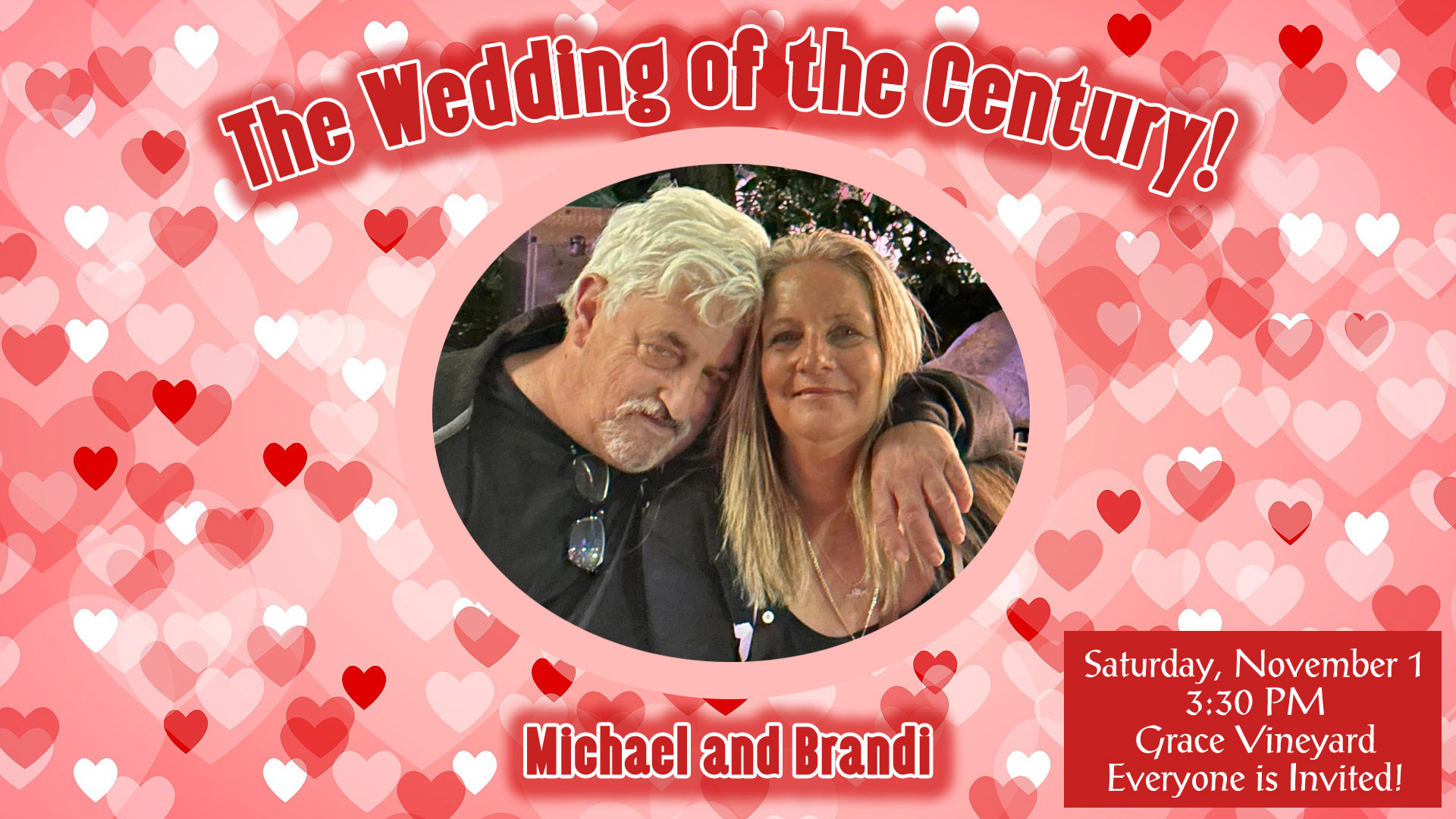 The Grace Vineyard Family is so excited to celebrate with Michael and Brandi today! We hope you can all join us at 3:30 for the wedding we’ve all been looking forward to. It is going to be a wonderful and beautiful celebration!