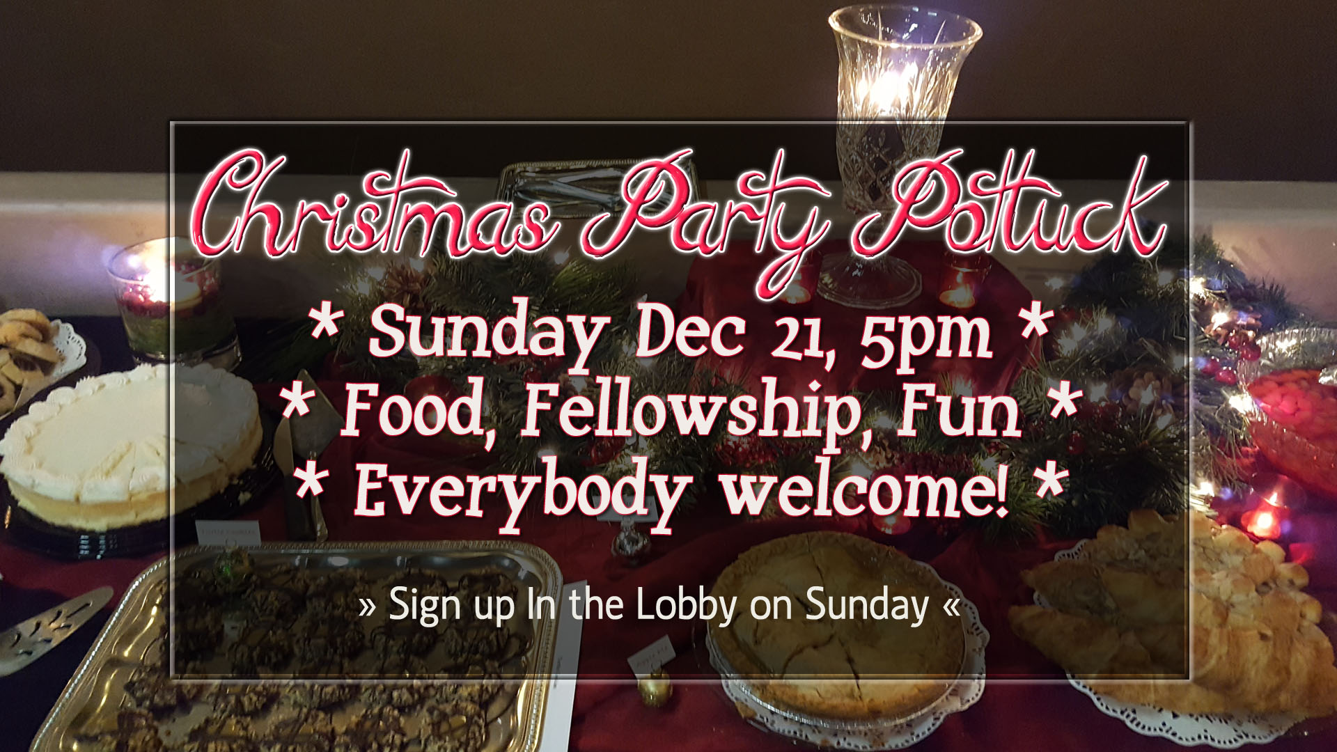 Please mark your calendars for Sunday, December 21, at 5pm. Our church seems to LOVE potlucks, and we do them really well. We are planning on having a Christmas Party Potluck at 5pm on Sunday, December 21. We’ll have sign-ups soon, but for now, just plan on being here, and start thinking about what deliciouis dish you’ll be bringing. Some Christmas baking would be nice in addition to the main and side dishes!