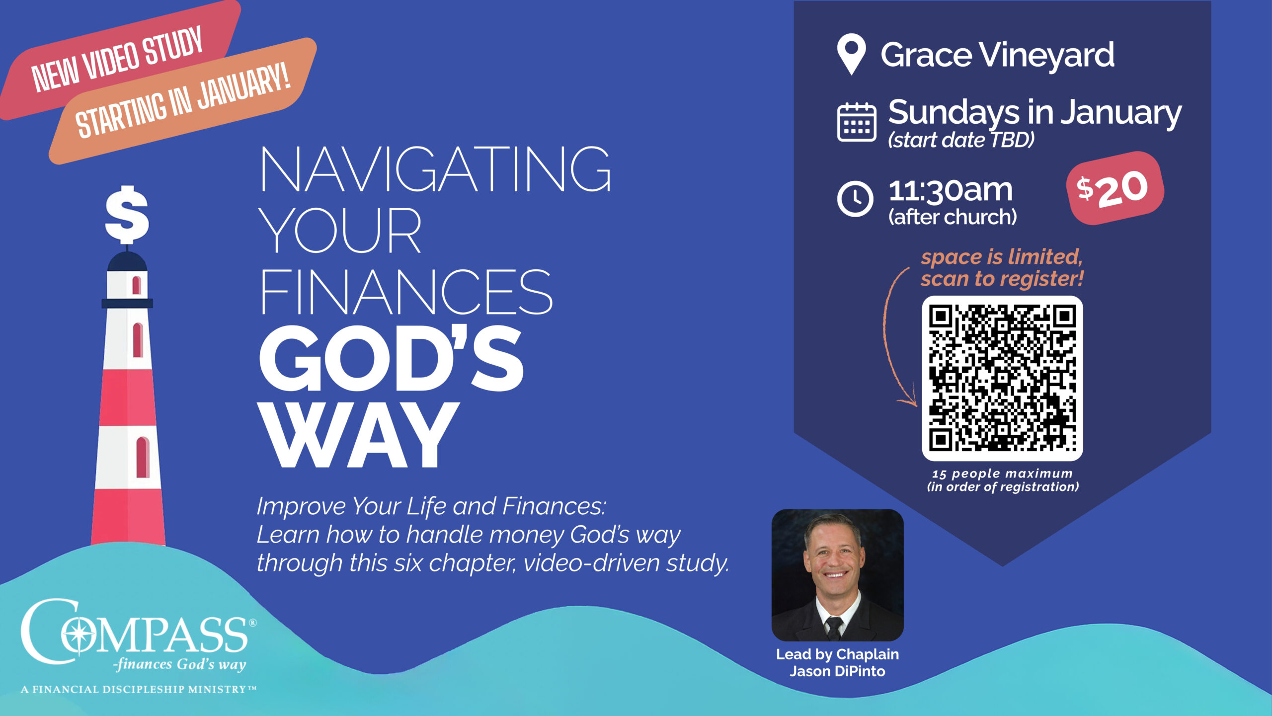 Starting in January, Chaplain Jason DiPinto is going to lead a financial study called “Navigating Your Finances God’s Way” from Compass Finances (A Financial Discipleship Ministry). Jason will be in the lobby on Sunday to answer your questions and take signups. It’s a six chapter, video-driven study and we’ll be meeting on Sundays at 11:30 after church. The start date is still to be determined. Space is limited – there is a 15 person maximum, so the first 15 people to sign up we’ll get to come to this one.