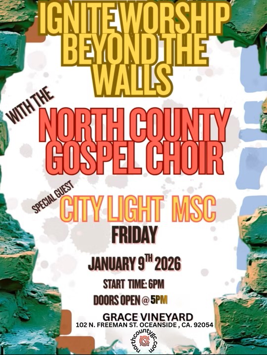 I am really excited that there is now a community Gospel Choir in North County.  I’ve actually been hoping and talking about this for a number of years now, and it’s finally a reality.  I’m even more excited that we are hosting their first worship event of 2026 at Grace Vineyard.  They’re calling it “Ignite Worship Beyond the Walls”, and it will be Friday, January 9th, at 6pm.  They’re planning on having food vendors with doors opening at 5pm, so you can come early and grab an early dinner right at the church.  If you’d like to learn more about the North County Gospel Choir (including how you can join the choir too), check out their website at https://www.northcountygc.com/